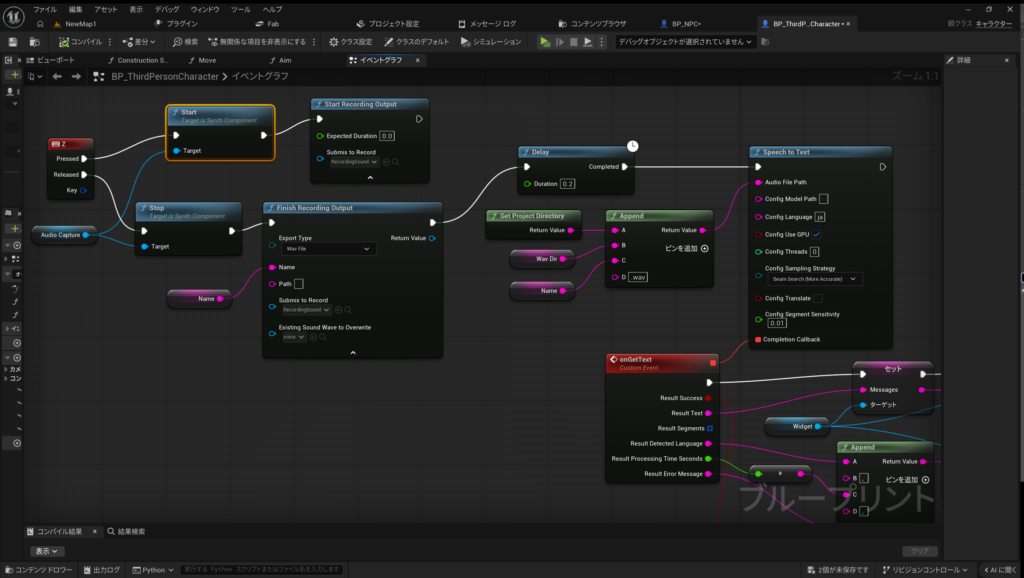 unreal speech to text zキーを押しながら喋る。audio capture コンポーネントで録音。wavファイルを保存。そのwavファイルを speech to text で文字列化する。delay はおそらくファイルを保存し終わるまで待つ。